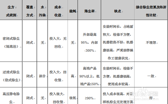 綜合除塵效果及經(jīng)濟(jì)性比較:如做好純水系統(tǒng),以及循環(huán)、速度等效果理想,不過(guò)成本較高,其他比較見(jiàn)圖片